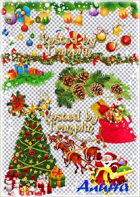 Разноцветный и разнообразный клипарт на тему нового года: мешки с игрушками, хвойные веточки и елка, украшения, Санта в саночках, колокольчики
