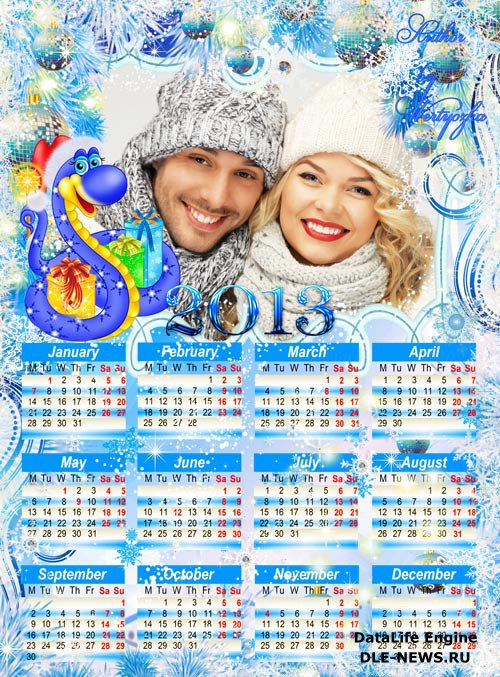 Календарь 2013 - Голубые елочные шары и змея с подарками