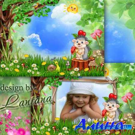 Многослойный детский PSD исходник с рамкой для оформления фото и создания коллажей - Я грибочки соберу, на пенечке отдохну